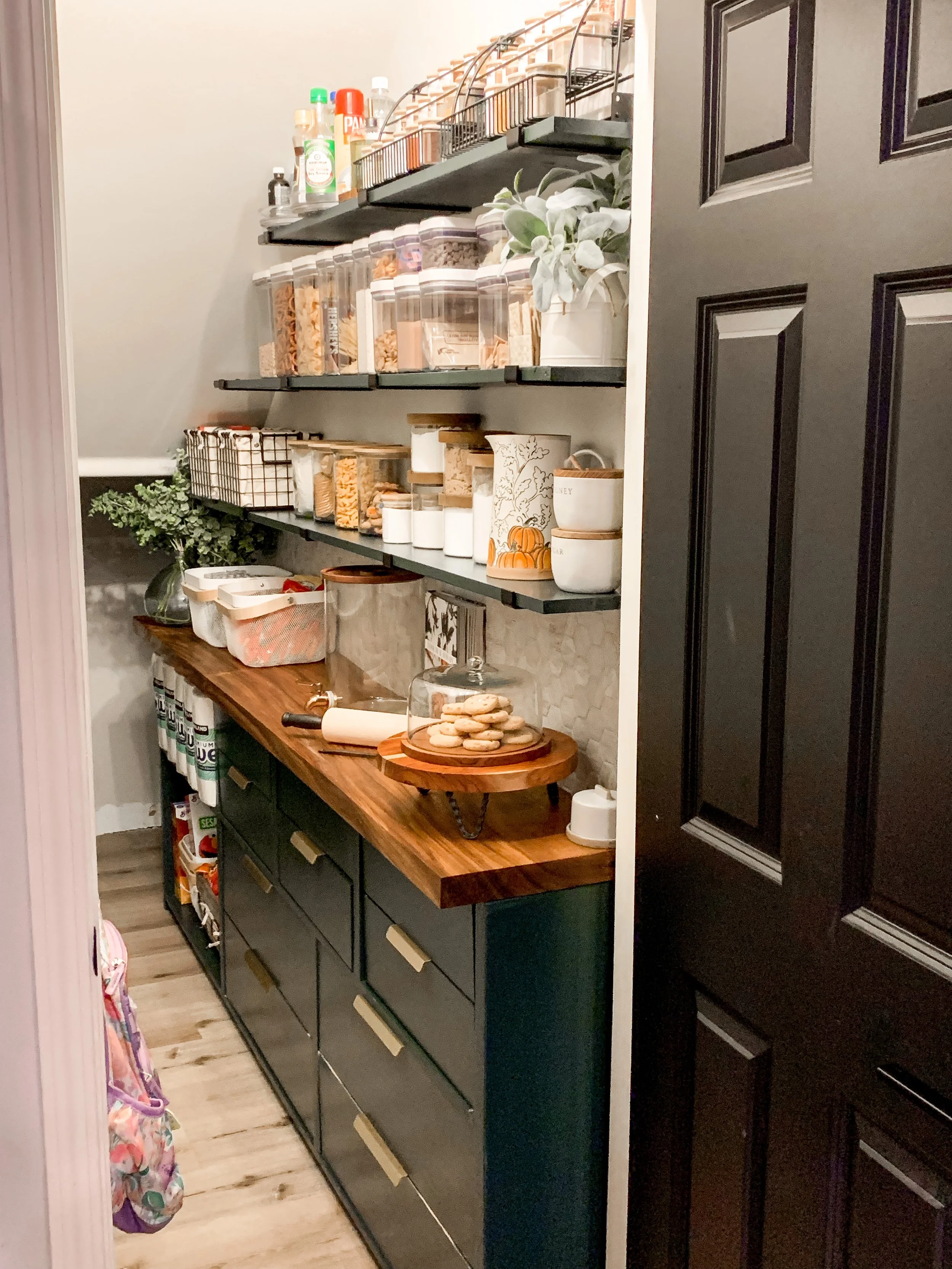 Under-the-Stairs Pantry with Organizing Drawers, Floating Shelves, Tiled Backsplash, and a 9-Foot Hawaiian Monkeypod Countertop