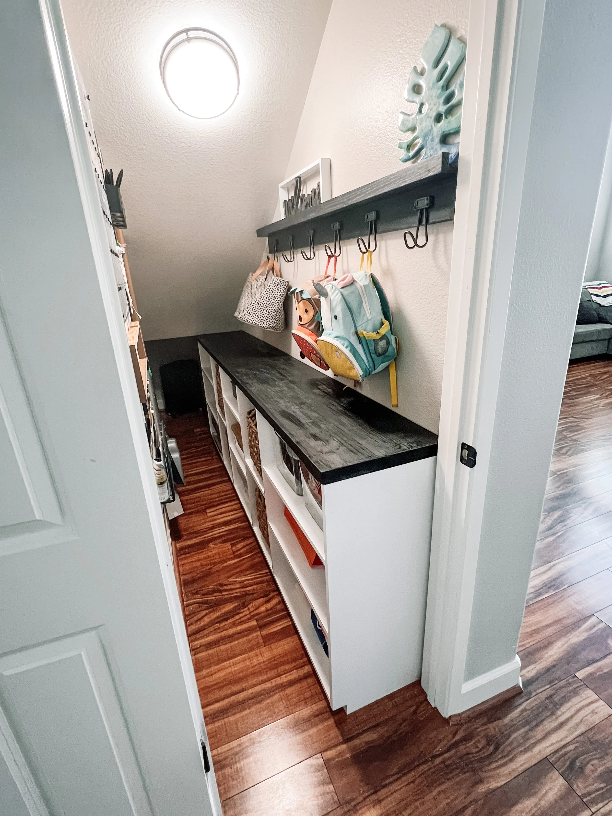 Under-the-Stairs Organization Command Center with Shelving, Bins, Backpack Hooks, and a Butcherblock Countertop