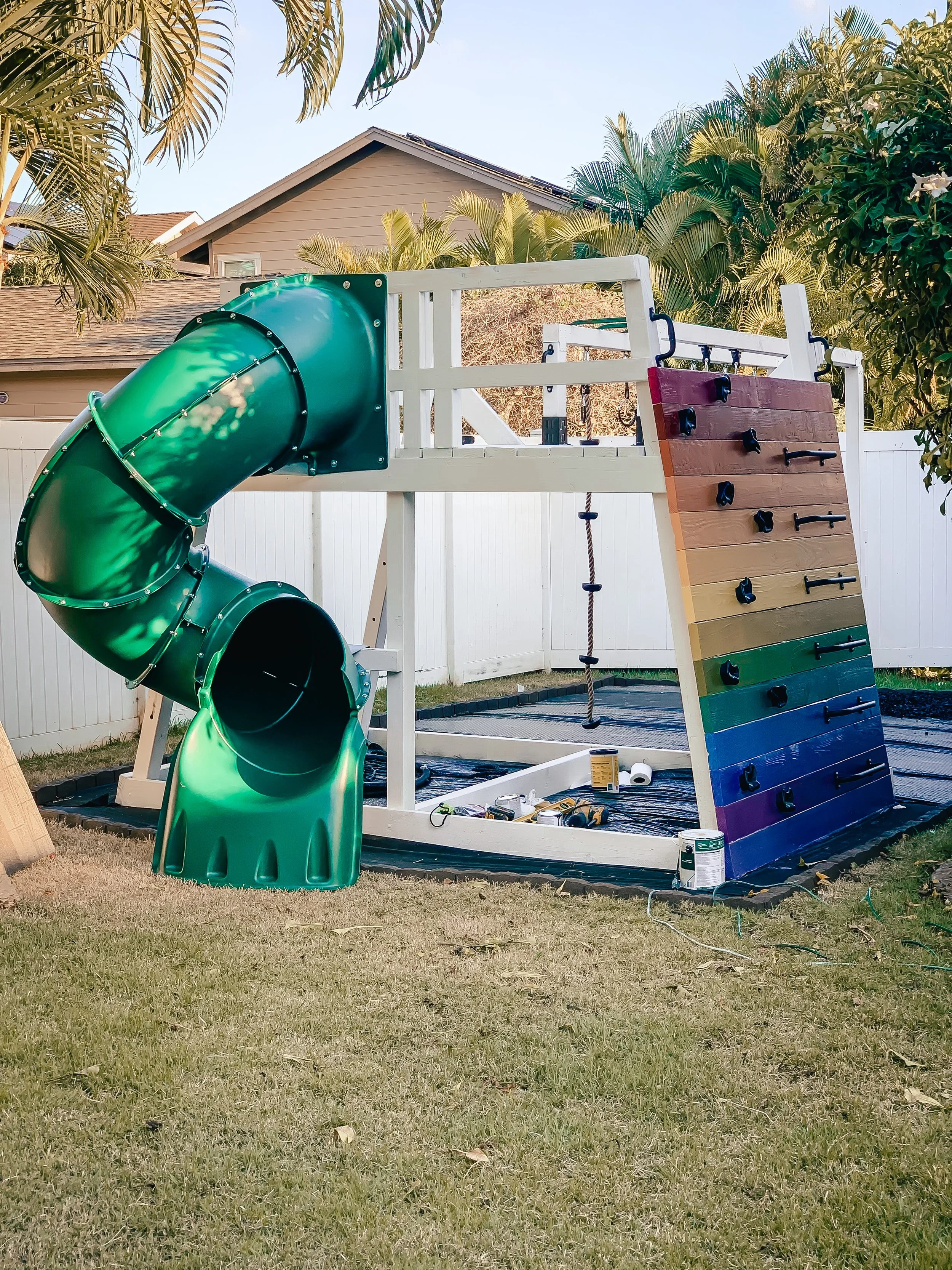 Custom Backyard Childrens Playground Featuring a Rock Climbing Wall, Swings, Monkeybars, Rings, Netted Rope Climbing Wall, Slide, Chalkboard and Magnetic Board Art Center, Rock Box Digging Center, and a Circular Swing