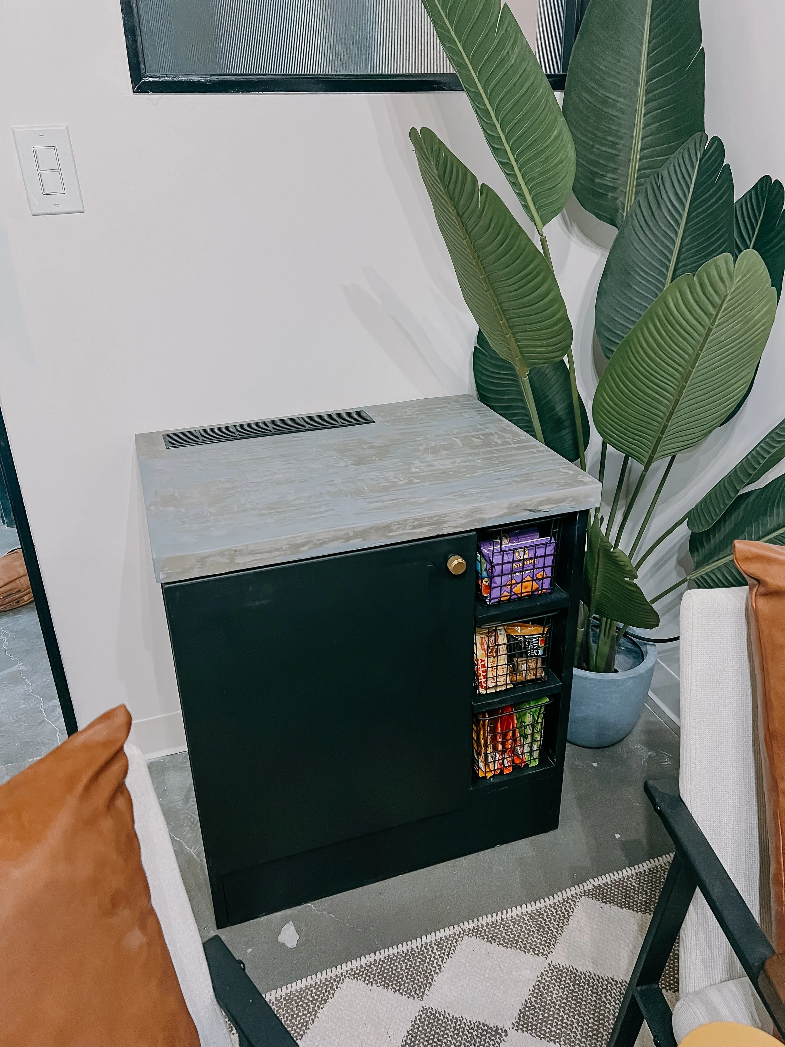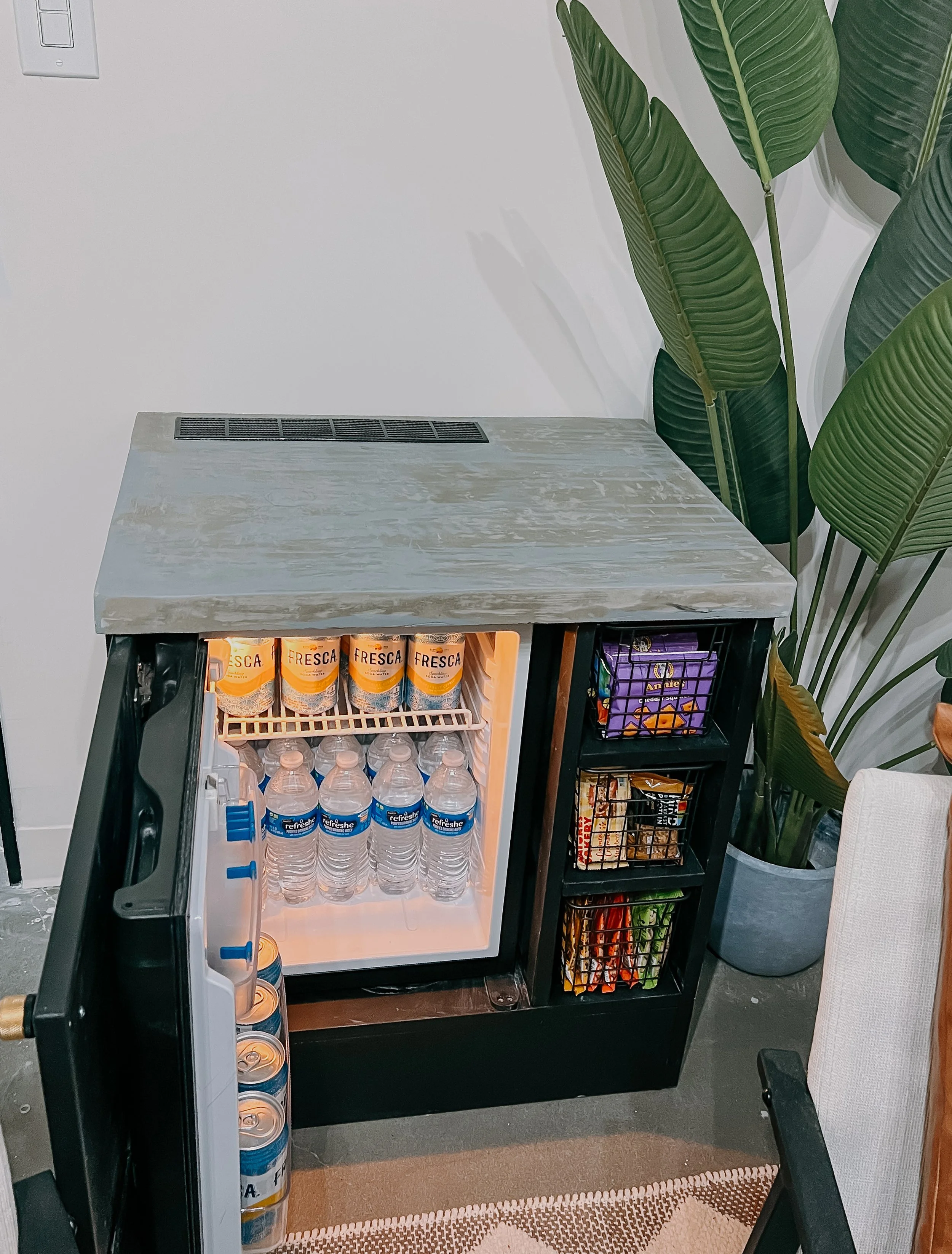 Inside of Custom Office Mini Fridge and Snack Bar with Concrete Countertop